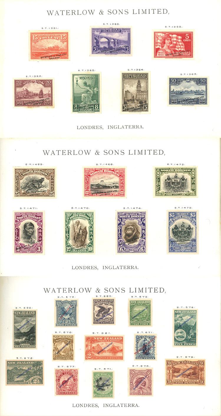Book of specimens of Waterlow & Sons Ltd. of London, containing 156 specimens of postage stamps and some revenue stamps of: Uruguay, Colombia, Spain, North Borneo, Ecuador, Costa Rica, Colombia, Panama, Mozambique Company, Guatemala, New Zealand, several British colonies, Thailand, Belgium, Venezuela, Portugal, El Salvador, Chile, and several more. Very fine general quality, extremely rare! (Image)