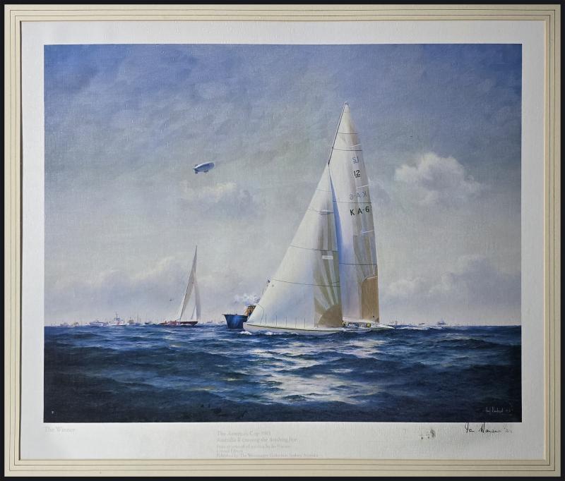 Posters & Prints cricket with 'The King of Spin - Shane Warne' by Joe Zapulla (signed), 'The Fast Men', 'Australia's Finest' & 'One Day Heroes'; 'The America's Cup 1983 - Australia II crossing the line' by Ian Hansen (signed); 'The Legend Bar'; 1970s golf poster, all framed, various sizes, Fair/Fine condition.