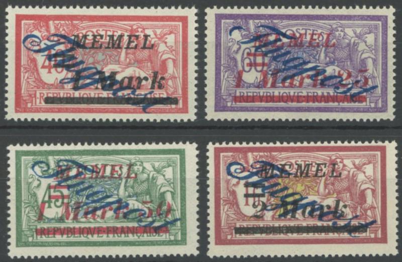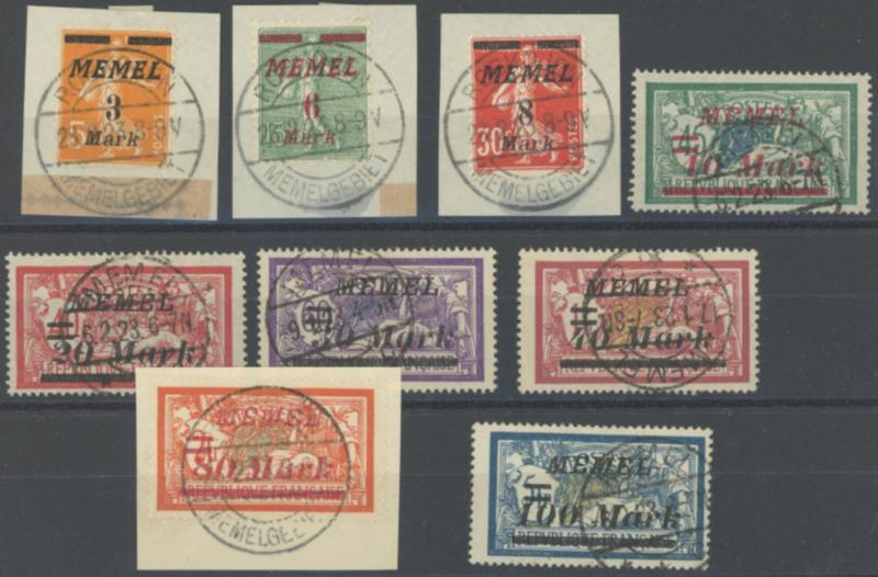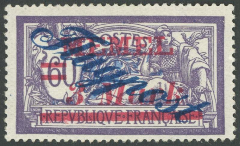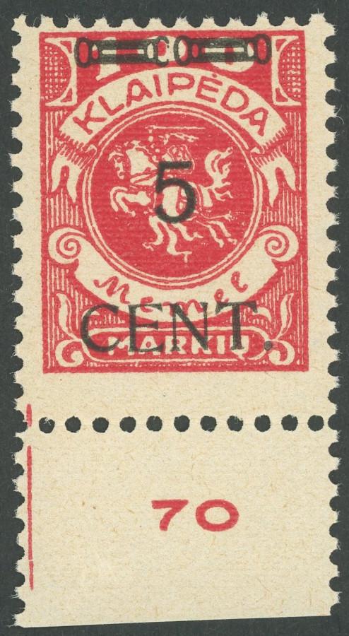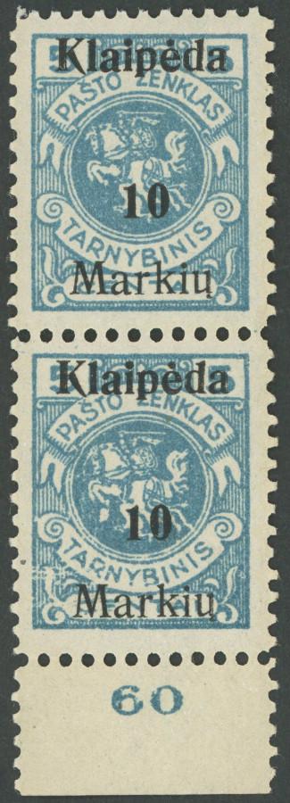 1923, 10 M. On 5 C. Greenish-blue, overprint without (Memel) and double beam in the vertical pair from lower margin, mint never hinged, superb, Michel (100.-) (Image)