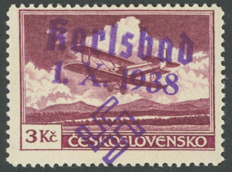 1938, 3 Kc. Blackish purple brown, perforated L 13 3 / 4, rest of hinge, superb, RR! Issued only 15! Expertized Mahr and photo expertize Brunel, Michel (1500.-) (Image)