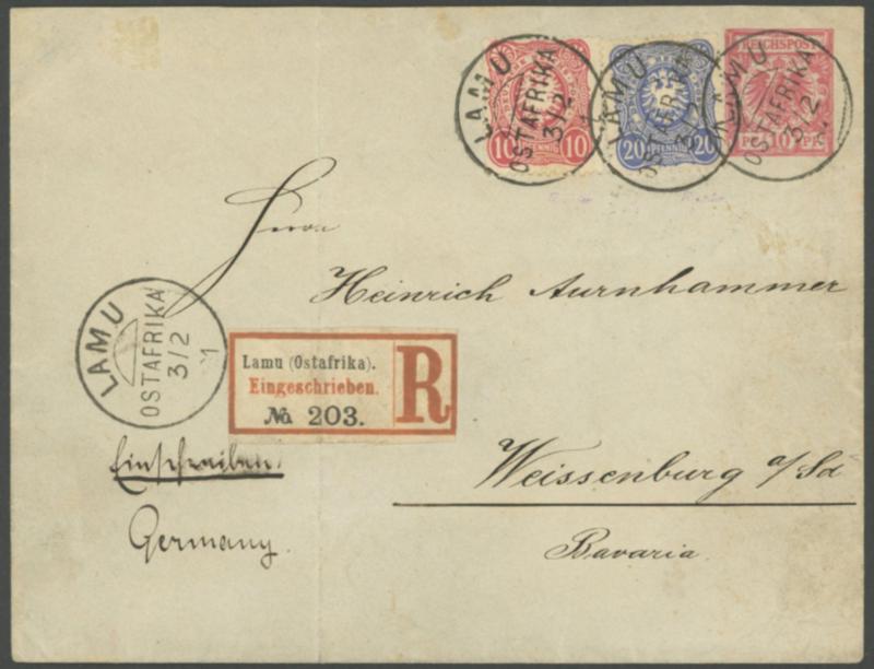 LAMU 3.2.91 on 10 Pf. Carmine postal stationery cover with 10 Pf. Rose red and 20 Pf. Dark ultramarine on registered cover to Weissenburg, insignificant slight vertical folding by the registered label, ußerst rare decorative superb cover, RR! (Image)
