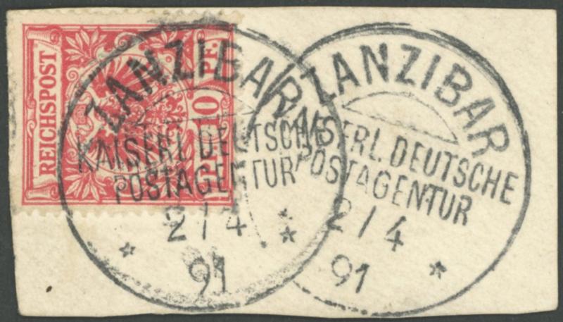 ZANZIBAR 2.4.91 on 10 Pf. Bright rose red, letter piece, very fine (Image)