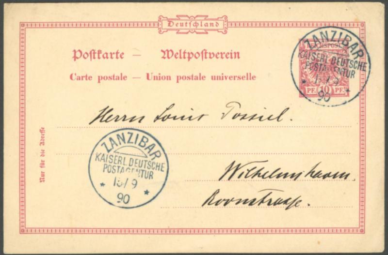 ZANZIBAR 15.9.90 in black blue, perfect on 10 Pf. Postal stationery postcard to Wilhelmshaven, superb in every respect (choice copy), R! (Image)