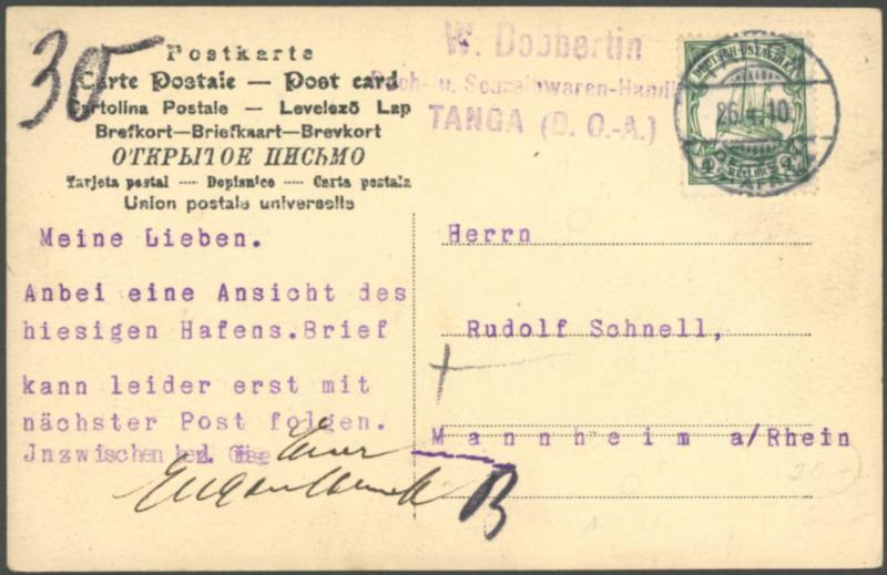 1910, 4 H. Dark green on picture postcard, private senders mark from TANGA, superb (Image)