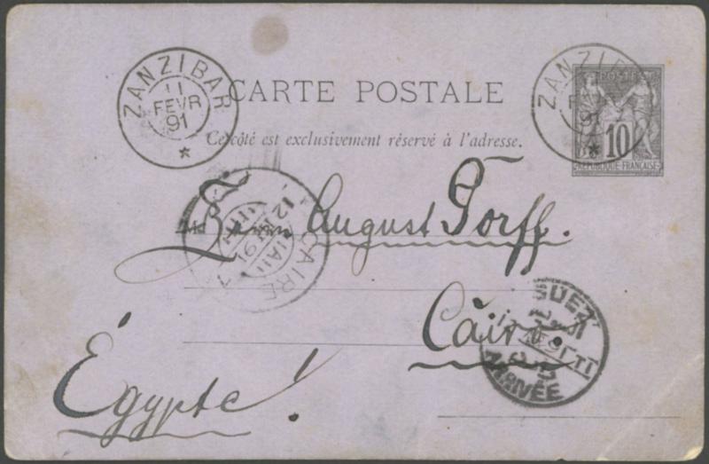 1891, Station Pangani, Lieutenant the D. East Africa protection troop Podleah Dar it Salam, French postal stationery postcard mailed by of the French post, two ring cancel ZANZIBAR 11.2.91 to Cairo, very fine (Image)