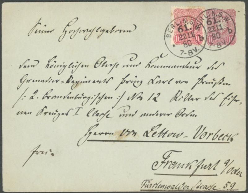 1880, letter from BERLIN S. W. 61 to Frankfurt/Oder to the fathers from Lettow Vorbeck with 5 line loyalty address, superb (Image)