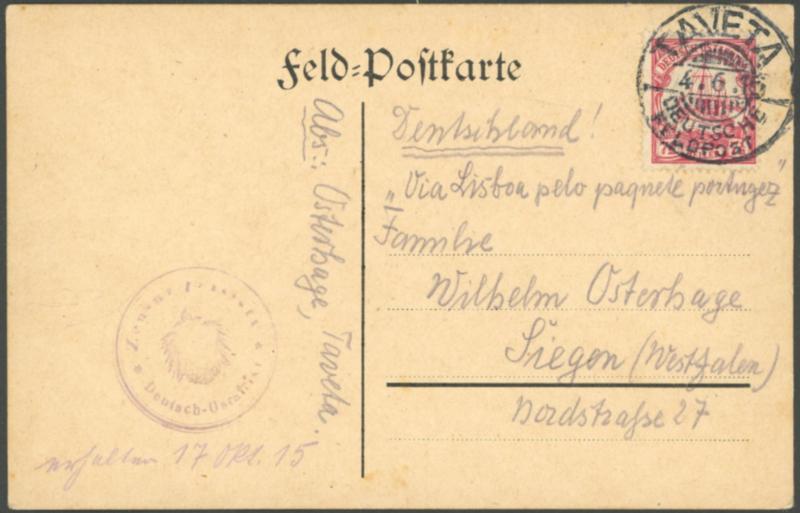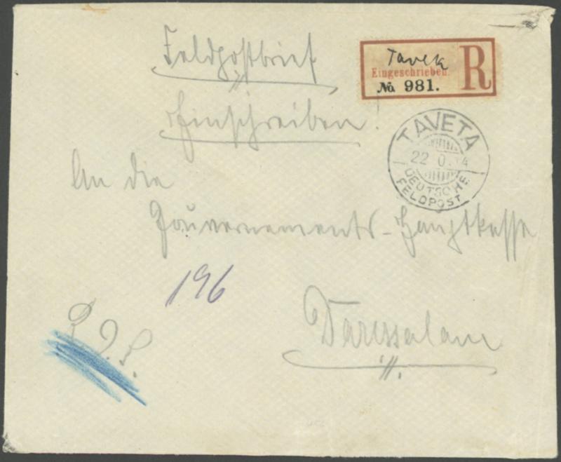 22.10.14, TAVETA, army postal service registered cover, Reichs service affair, handwritten registered label to Daressalaam, on the back arrival postmark DARESSALAAM *a, as usual trace of creases, superb, R! (Image)