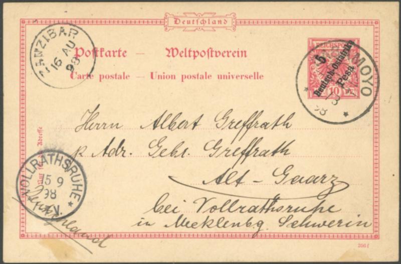 1898, 5 Pesa on 10 Pf. Carmine from BAGAMOYO over ZANZIBAR to Wollrathsruhe, superb (Image)