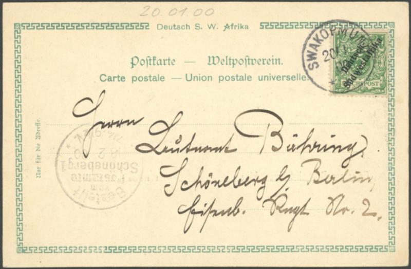 1900, 5 Pf. Opal green on picture postcard, with postmark SWAKOPMUND, written in HASIS, km 147, superb postcard to Berlin (Image)