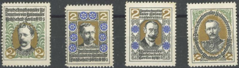 Approximate. 1920, German national Kolonialverein: Lüderitz, Nachtigal, Peters and Wissmann, 4 vignettes as forerunner of the 1934 published set colonial researcher (Michel number 540-43), mostly superb (Image)