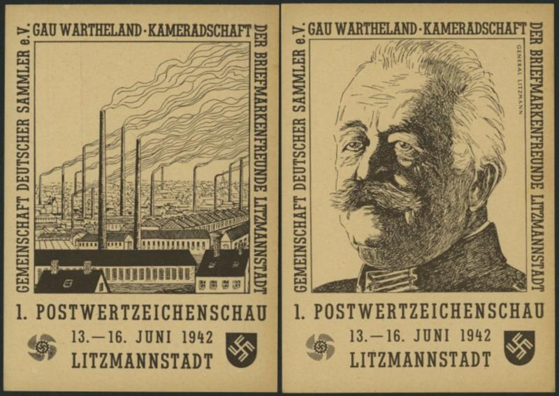 Private post: 6 Pf. Hitler "1. Postage stamp show 13.-16. June 1942 Lodz", industrial landscape and General Litzmann, unused, 2 superb cards (Image)