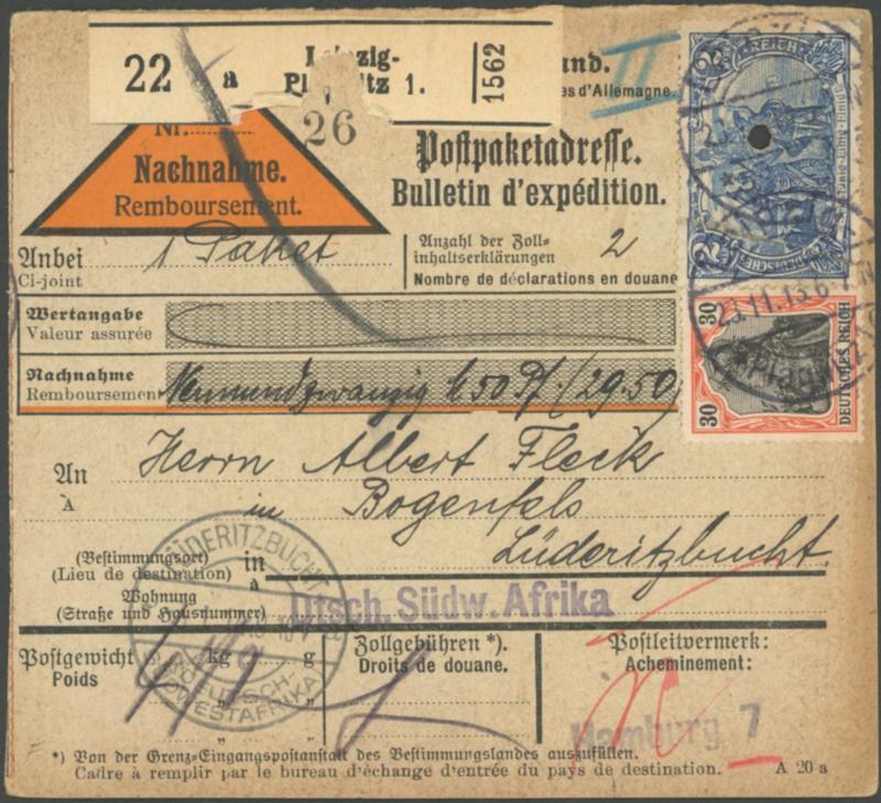 LDERITZBUCHT, 3.1.14, as arrival postmark on C.O.D. Package card from Leipzig, German Reich franking vorschriftsmßig punched, to Bogenfels! Superb, R! (Image)