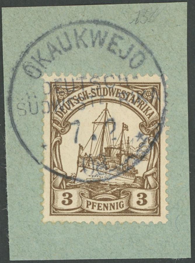 OKAUKWEJO, 7.2.08, on 3 Pf., superb piece of letter, expertized Mansfeld (Image)