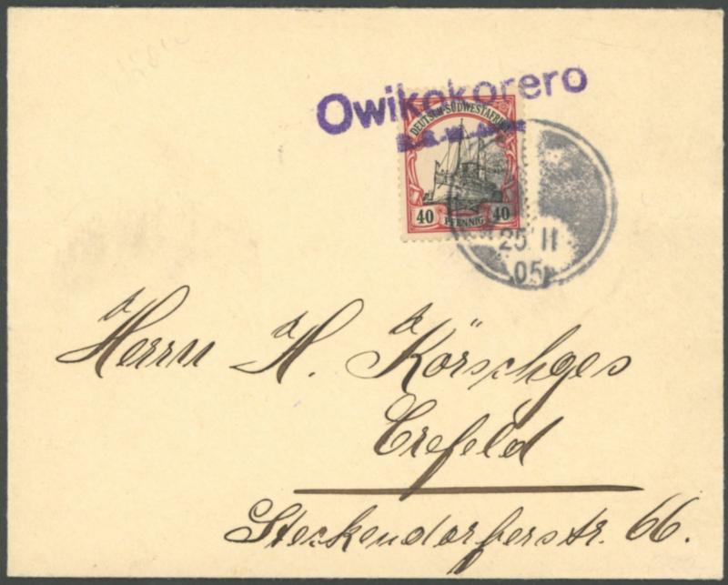 OWIKOKORERO, 25.11.05, violet rubber cancel, on cover with 40 Pf. To Crefeld, superb, R! Expertized Bothe (Image)