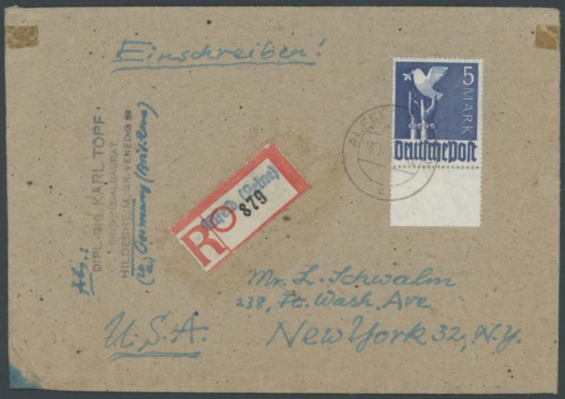 1948, 5 M. Dark purple ultramarine, lower margin copy, superb item on postage exceeding tariff rate registered cover to the United States, photo expertize H. D. Schlegel (Image)
