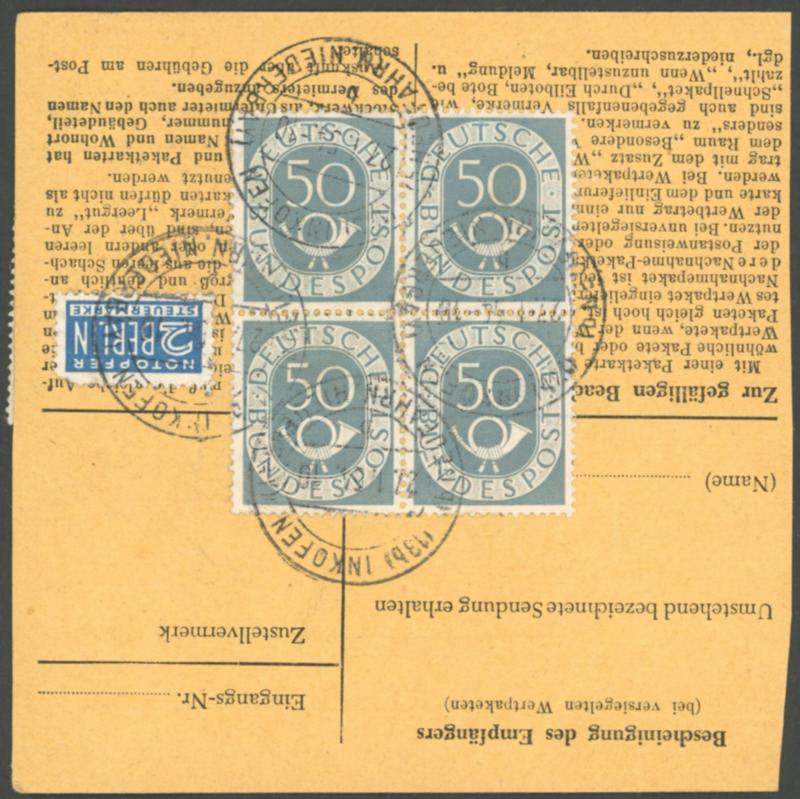 1954, 50 Pf. Posthorn in the block of four reverse on package card with 3 time 50 Pf. Additional franking from INKOFEN, multiple franking, superb (Image)