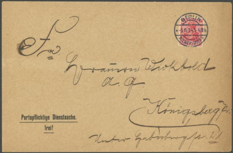 1914, 10 Pf. Orange red peace printing, perfect used BERLIN WILMERSDORF 1 on properly franked single franking on liable to payment of postage offical matter the Reich Insurance Institution FR staff with accordingly punching R. F. A, superb cover, RR! Photo expertize Jschke L, Michel (6.000.-) (Image)