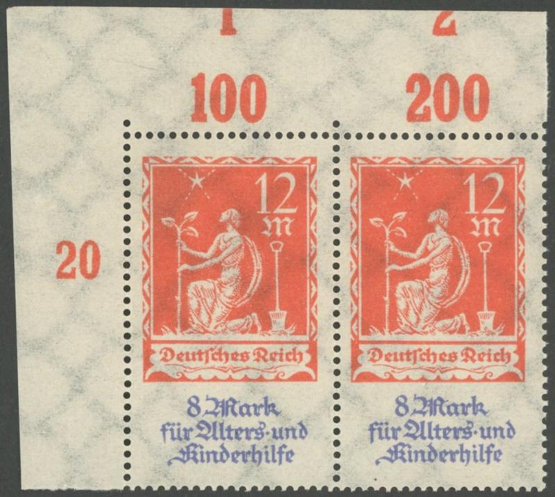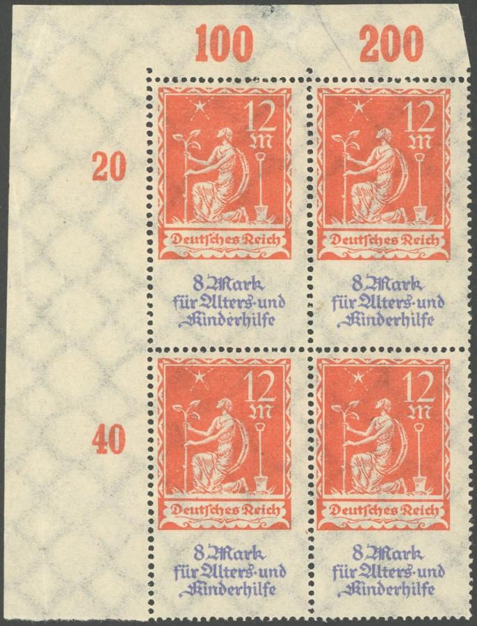 1922, 12 M. Allegory with plate flaw f lower left bevelled (field 1), in the upper left corner margin block of four, mint never hinged, superb (Image)