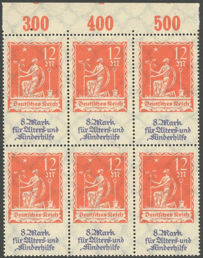 1922, 12 M. Allegory with plate flaw M under numeral of value left above thickened (field 5), in the upper margin block of six, mint never hinged, superb (Image)
