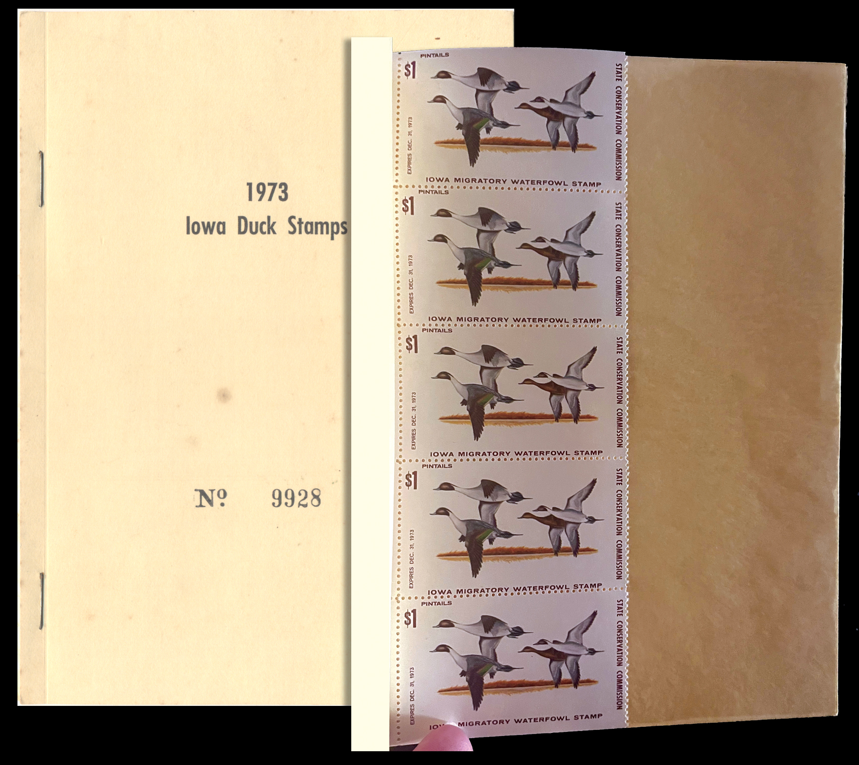 IA2,Iowa 1973 Pintail, Strip of 5 in booklet, VF NH, top and bottom stamps with minute foxing Cat($175) (Image)