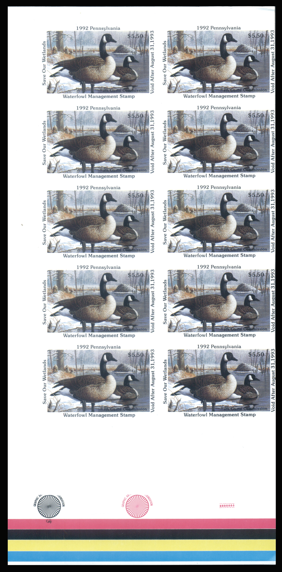 PA10v3,Pennsylvania 1992 Proof, Pane of 10, full selvage at bottom containing print registration marks and CMYK color bars, no serial numbers, F-VF NH (Image)