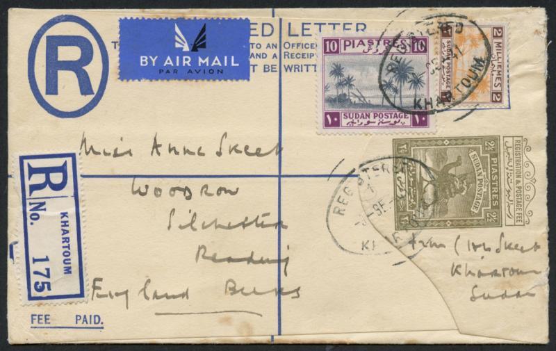Unusual postal stationery usages comprising Envelopes 1pi to France uprated with 1m 4m 5m & 1pi, and '5.MILLIEMES' on 1pi to Cairo; and Registration Envelopes 15m to Canada with 5m & '3 PIASTRES' on Gordon Airs 3½pi, to Aden with 5m & 10pi; 2½pi to India with 5m & 8pi (endorsed from "British Army & Air Force Contractor"), to USA with 4m & 5pi, to England with Tuti Island 2m & 10pi; and 3½pi to England with 4pi & damaged 50pi.
