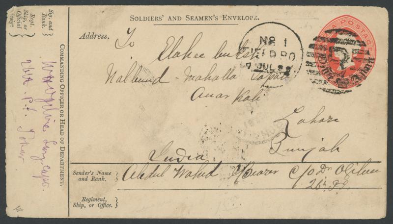 1896 (July 9) Dongola Campaign - Suakin usage of Indian 'SOLDIERS' AND SEAMEN'S ENVELOPE' 1a on 9p correctly endorsed & countersigned at left "WH Ogilvie Surg Capt/26th PI Tokar" (= Punjab Infantry) with largely very fine strike of the 'No 1/FIELD PO/7JUL96 - B' duplex, to the Punjab with 'SEA POST OFFICE/ C /JL20/96' transit and 'LAHORE/28JL/96' arrival backstamps, minor blemishes & light stain on the reverse. A rare usage from the second deployment of Indian troops to Suakin, & the only example we have seen endorsed "Tokar". The troops arrived in -.1.1896 & returned to India in -.11.1896. Ex Peter Smith: sold for SFr430. (Image1)