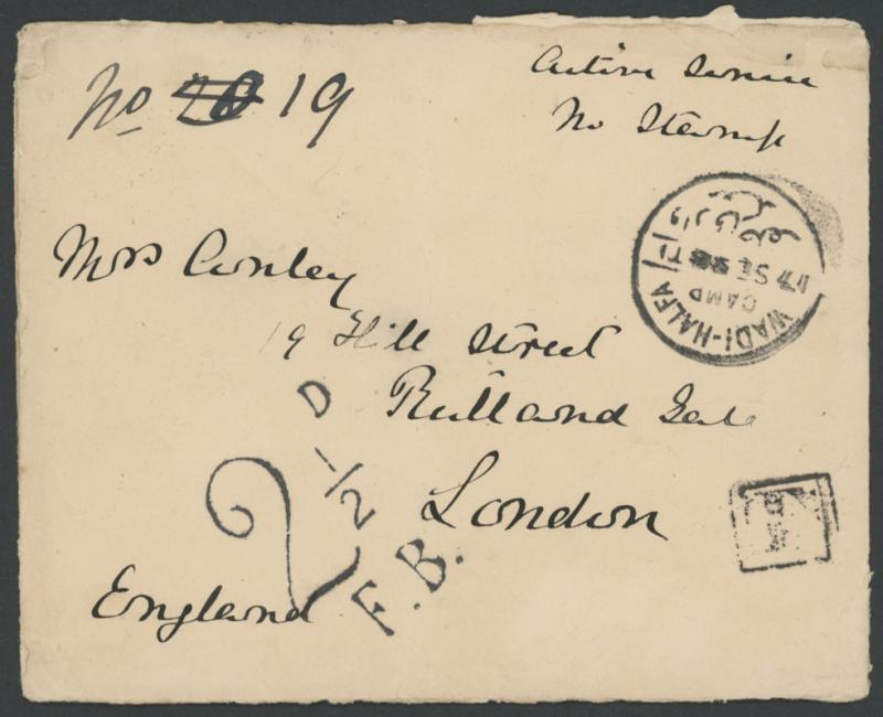 1896 (Aug) Dongola Campaign officer's cover to London with 'WADI-HALFA/ CAMP /...' cds & doubled 'T'-in-box handstamp, Cairo transit & 'LONDON/30SP/96' backstamps, superb strike of '2½D/F.B.' handstamp, part of the flap missing & the two panels separated & rejoined. With two 4pp 8vo letters - one headed "Dulgo 13th Aug 96" - & signed "FG Anley" or "Gore Anley" [Captain (later Major-General) Frederick Gore Anley] who states this will be his "last letter before we reach Dongola...For the next 3 weeks I expect we will be marching & fighting without rest every day...I always think men do better if they know exactly what they are required to do...". He speaks of harsh weather causing 1500 men being helped on baggage camels & that 12 died. "We really have not enough transport...the country is so frightfully mountainous that the camels have to go single file...no newspaper correspondents have been allowed...one or two chaps have been allowed to write letters to the papers..." Dulgo was a small military post on the railway line from Egypt. It had no post office.