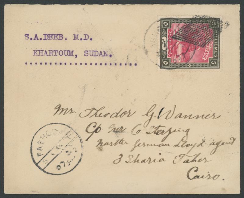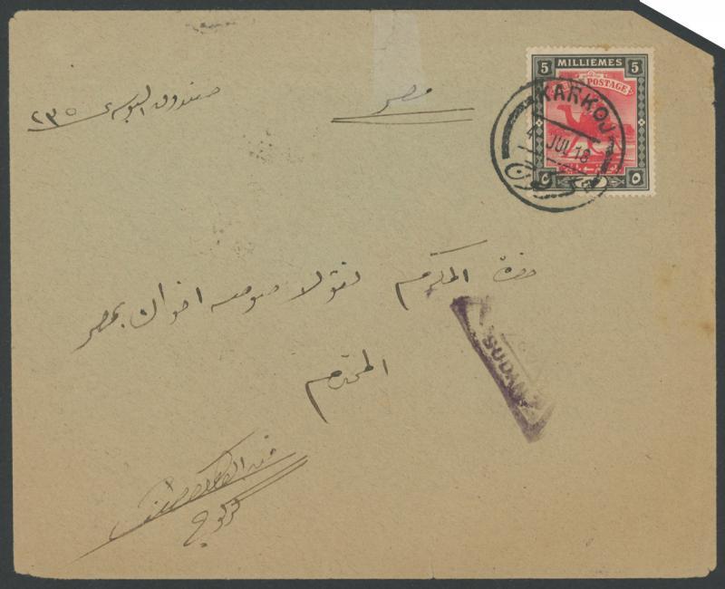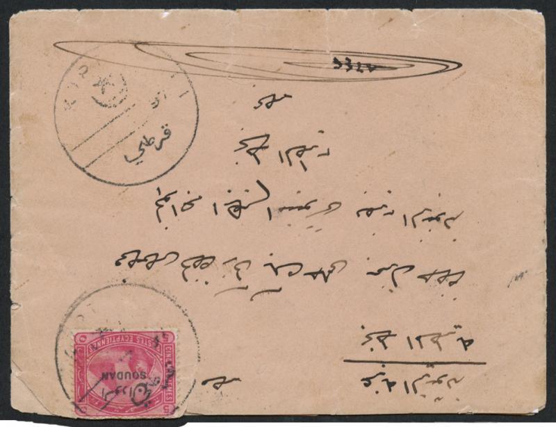 1897 (June) native cover to Cairo with Overprints 5m tied by two almost fine strikes of 'KORTI/[star & crescent]/----97/...' cds, three June 1897 backstamps. Rare: withdrawn circa 1885 after the re-taking of Khartoum & reintroduced for a brief period when Korti (2) opened circa -.6.1897. Ted Proud incorrectly states the PO opened in 1902. (Image1)