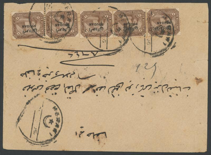 1897 (Aug) internal native cover with scarce franking of Overprints 1m x5 tied by three of four fine strikes of the worn 'MERAWI/[star & crescent]/----96' (date error) cds, large-part 'HALFA/25 VIII 97/...' arrival backstamp, very minor blemishes. Merowi (2) PO 1897. The cds is of the 1870s-pattern, indicating that there was an earlier office of this name. The obvious wear to the device, and the year '96' apparently being rusted in place, support this suggestion. On most strikes the day and/or month slugs are missing. (Image1)