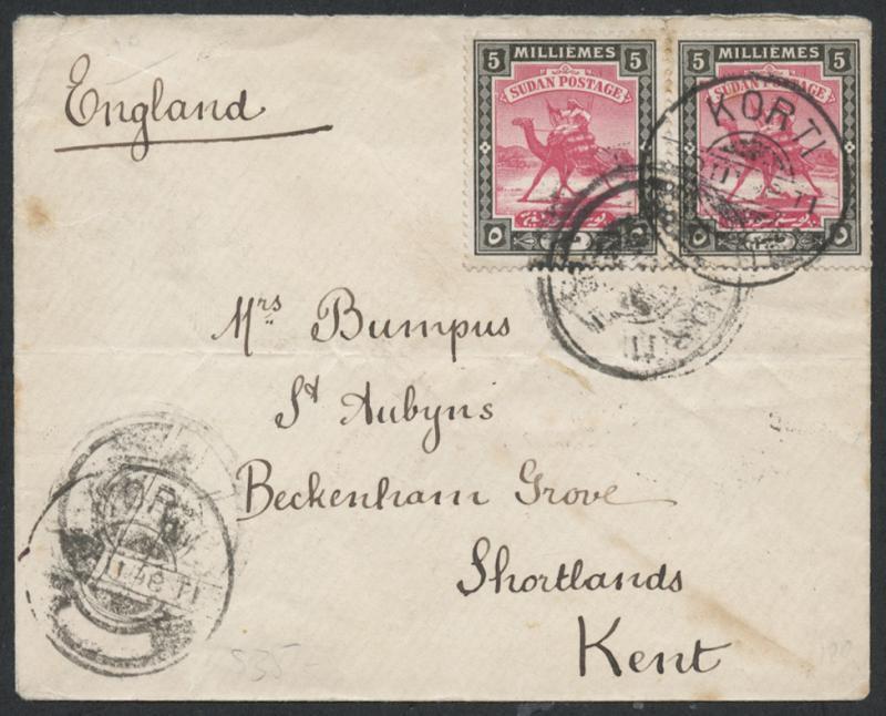 1898 (Mar 29) cover to Kent UK with 5m tied by a very fine (and two poor strikes) of the rare 'KORTI/29.III.98' cds with blank tablet at the base (Proud 20,000pts on cover), light horizontal fold clear of the stamps & postmarks. Korti (2) PO -.6.1897. (Image1)