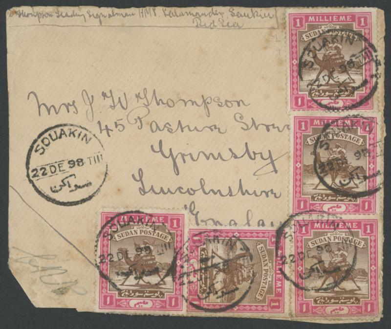 1898 (Dec 22) Second Nile Campaign sailor's letter - front only - endorsed "...HMS Salamander Saukin/Red Sea" and countersigned with initials at lower-left clear of the clipped corner, to Lincolnshire with Camel Postman 1m x5 & multiple strikes of 25mm 'SOUAKIN/...' cds, light damp-spotting. (Image1)