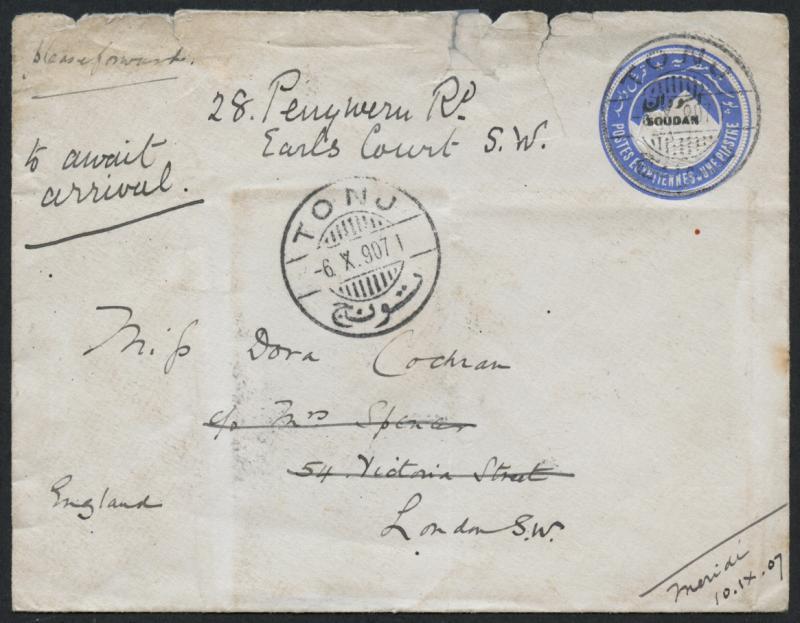 1907 Overprinted 1pi Envelope (repaired opening tears) endorsed "Meridi/10.IX.07" at lower-right, to London with two very fine to superb strikes of 'TONJ/6.X.907/...' cds, very fine Khartoum backstamp of 14.XI.907. Tonj (1) PO 26.4.1905 when Runner Mail service extended from Meshra-el-Rek; closed circa 1923. Meridi, in the far south, 250km SSE of Tonj, near the Belgian Congo border, had no post office. The cover took 26 days to reach Tonj, and another 39 days to reach Khartoum. Most of the 140km between Tonj & Meshra-el-Rek is swampland. (Image1)