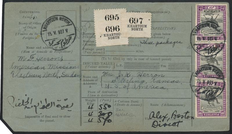 1927 black/grey 'BULLETIN D'EXPEDITION' (200x113mm) with 2pi x2 5pi pair & 10pi on the reverse & 10pi strip of 3 on the face all tied by very fine 'KHARTOUM NORTH/15,V,927/...' cds, small black/white 'KHARTOUM/NORTH' parcel post labels #695-7 & endorsed for three parcels each between 4 & 5lbs (tribal artefacts?) to Kansas from a missionary, minor corner fault. Very scarce parcel item. (Image1)