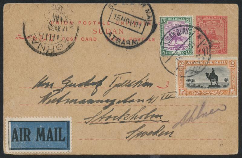 1931 (Nov 15) airmail usage of 15m red Postal Card to Sweden with 3m & Gordon Airs 2pi tied by 'PORT SUDAN QUAYS' cds, superb large-part 'SU[DAN AI]R MAIL/ATBARA' cds with boxed-date & Athens transit, full message in Swedish. Airmail postcards, and especially excellent postal stationery usages, are very scarce. (Image1)