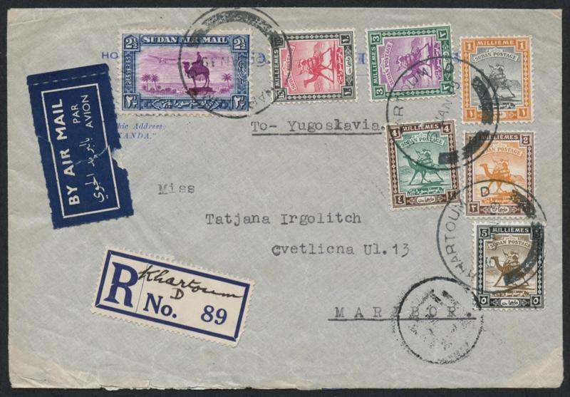 1939 (Jan 6) airmail cover to Yugoslavia with vibrant franking tied by four very fine strikes (one on the reverse) of 'KHARTOUM D /6 JAN 39' single-ring skeleton relief (Proud D34; recorded 17.3.1938 only), manuscript "Khartoum/D" (= Despatch ?) on provisional R label, Greek currency control handstamp, Athens cds & 'MARIBOR 1/11.1.39/...' arrival backstamps. (Image1)