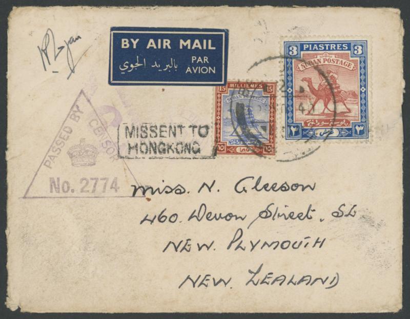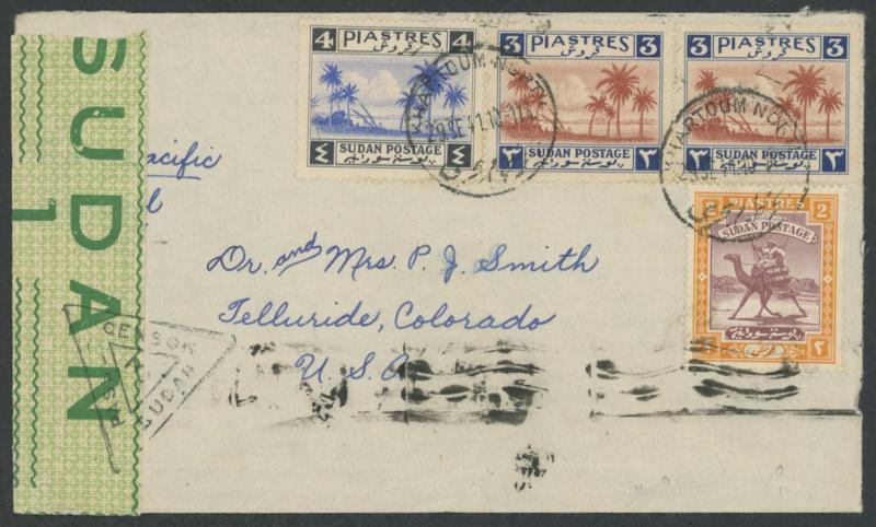 1941 (Sep 29) missionary's cover (endorsed on flap) airmail to Colorado USA with Camel Postman 2pi and Tuli Island 3pi pair & 4pi tied by very fine 'KHARTOUM NORTH/...' cds, green/green censor '1' label tied by triangular '3' cachet in violet, flown BOAC to Singapore, Qantas to Sydney, TEAL to Auckland & PanAm FAM19 to San Francisco, minor repaired flap-fault. (Image1)