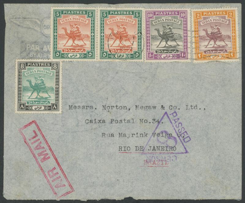 1940 (Nov 28) Cotts Darke & Co cover airmail to Brazil with 2pi 5pi pair 8pi & 10pi tied by Khartoum machine cancel most unusually not censored in Sudan, offloaded at Calcutta & flown 'Across the Hump' into China per CNAC & on to Hong Kong (backstamp of 23DE/40) where Censor '8' cachet struck in violet, then per PanAm Clipper to San Francisco, domestic service to Miami, then flown to destination with '2aSEC-ASSINANTEC/10/JAN/41/BRASIL' arrival backstamp, minor wrinkles. A marvellous cover at 30pi rate, flown three-quarters of the way around the world to a very scarce destination. (Image1)