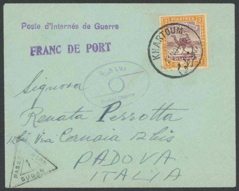 1940 Italian Internees in Sudan four covers from different senders all to Italy with 2pi tied by 'KHARTOUM' cds of Nov or Dec 1940, two with 'Poste d'Internés de Guerre' handstamp & different 'FRANC DE PORT' cachets all in violet, those also with Sudan triangular censor & Egyptian oval censor, three with large Red Cross at Geneva cachet (one on the face), one with the flap missing otherwise all are very fine. Scarce quartet. By July 1941, some 79,000 Italian POWs were held in the Sudan. We could find no information about civilian internees, including why their mail wasn't free.