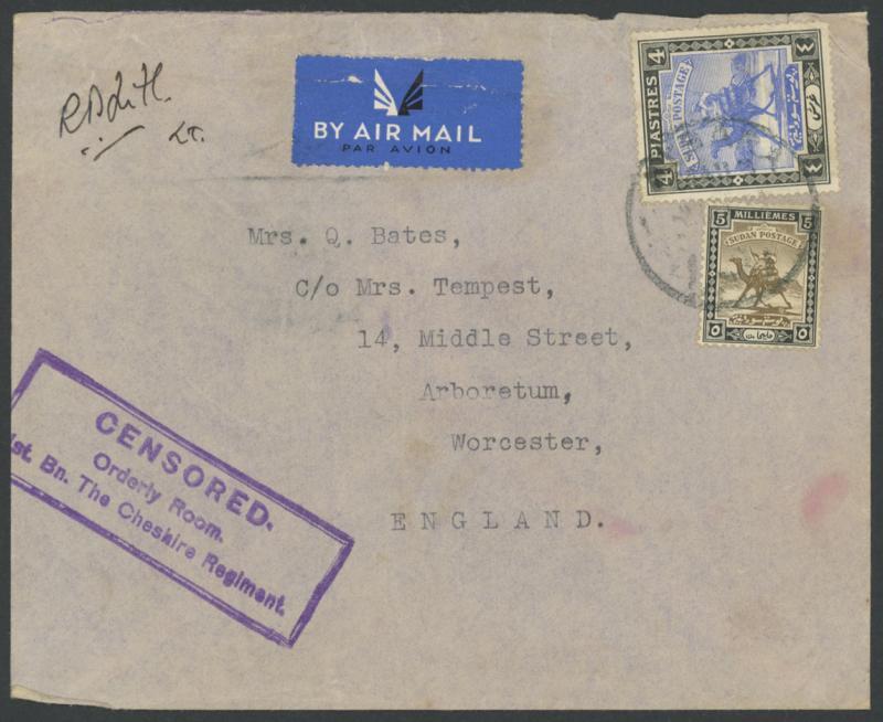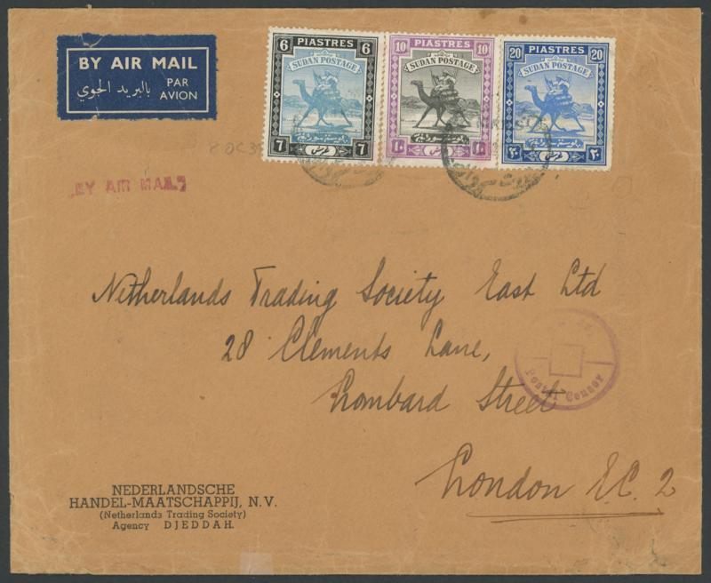 1942 (Oct) Horseshoe Route airmail cover with imprint '.../Netherlands Trading Society/Agency DJEDDAH' (Saudi Arabia) to the company's office in London with rare franking of Camel Postman 6pi 10pi & 20pi tied by light 'PORT SUDAN/MAILS/8OC39/...' cds, Cairo transit backstamp of 22OC42, resealed with Egyptian blue/white censor tape across the flap tied by censor '2' cachet & a different censor cachet in violet on the face, minor blemishes. The rate was 4½pi per ½oz x8. A remarkable cover. (Image1)