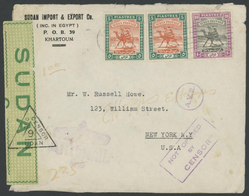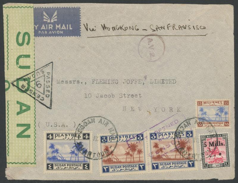 1941 (Apr 03) cover airmail to New York "Via Hongkong-San Francisco" with Camel Postman '5 Mills' on 15m and Tuli Island 15m 3pi pair & 4pi tied by 'SUDAN AIR MAIL/3.IV.41/KHARTOUM' cds, green/green censor '9' label tied to both sides by very fine triangular '9' cachet, offloaded at Calcutta & flown 'Across the Hump' per CNAC via China to Hong Kong with '24AP/41' backstamp where 'NOT OPENED/BY/CENSOR' & 'A.V.2'-in-circle cachets both in violet applied, then PanAm Clipper to San Francisco, very minor wrinkles. (Image1)
