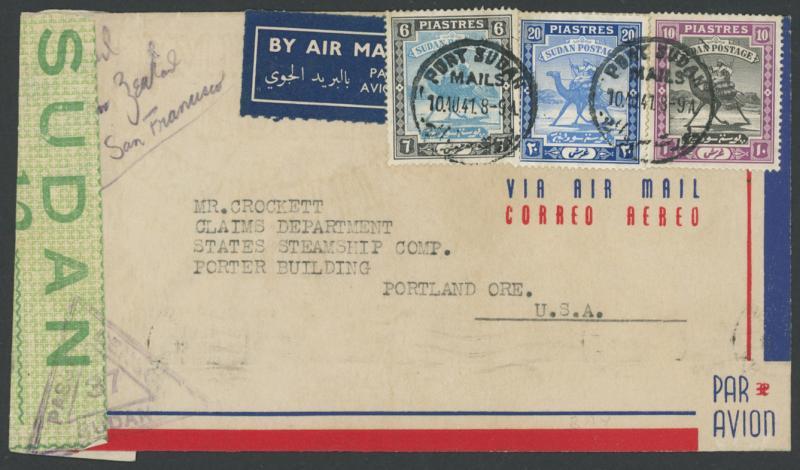 1941 (Aug 10) triple-rate cover airmail to Oregon USA with Camel Postman 6pi 10pi & 20pi tied by very fine 'PORT SUDAN/MAILS/...' cds, green/green censor '12' label tied by triangular '37' cachet in violet, flown BOAC to Singapore, Qantas to Sydney, TEAL to Auckland & PanAm FAM19 to San Francisco, a little aged. Very high wartime rate. (Image1)