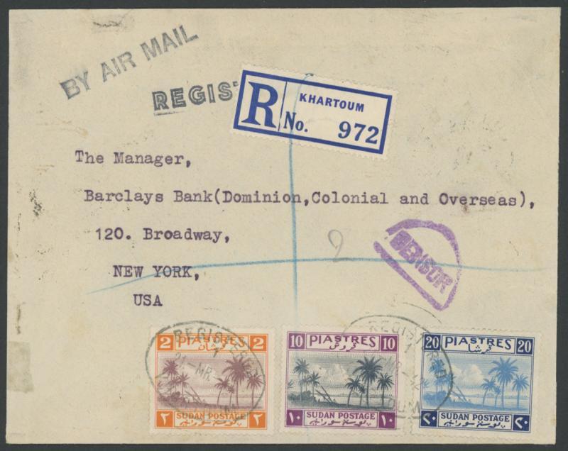 1942 (Mar 21) Barclay's Bank cover airmail to their branch in New York, USA with scarce franking of Tuli Island 2pi 10pi & 20pi tied by oval 'REGISTERED/21-MR-42/KHARTOUM' datestamp, blue/white R label, 'CENSOR'-in-semi- circle handstamp of Lagos Nigeria in violet, very minor blemishes. Delightful. (Image1)