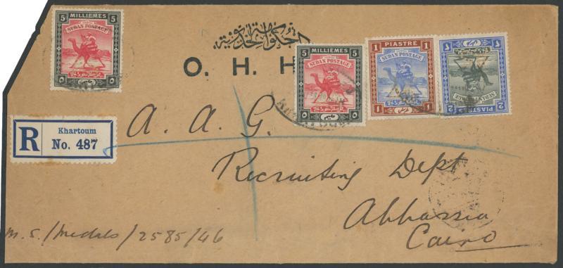 OFFICIAL MAIL: Army Service 'AS' Punctures three long 'OHHS' covers from Khartoum to Cairo 1) 1916 to "Director of Supplies" with 5m, vertical fold at left; 2) 1917 to "1st Echelon GHQ EEF" with 1pi, two vertical folds; and 3) registered to the "Recruiting Department" with 5m x2 1pi & 2pi tied by oval datestamp, clipped corner at upper-left. Scarce trio.