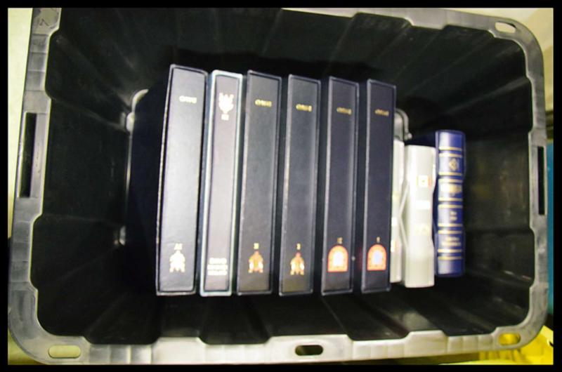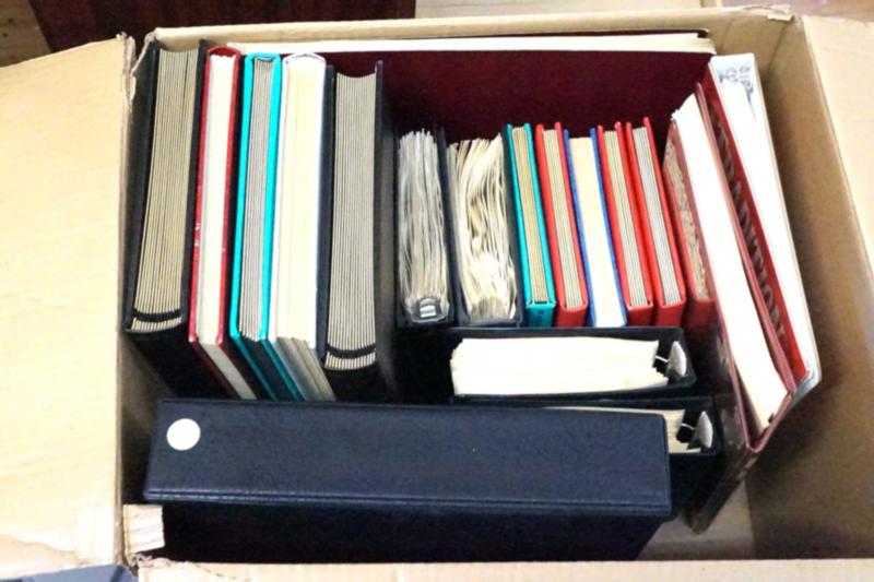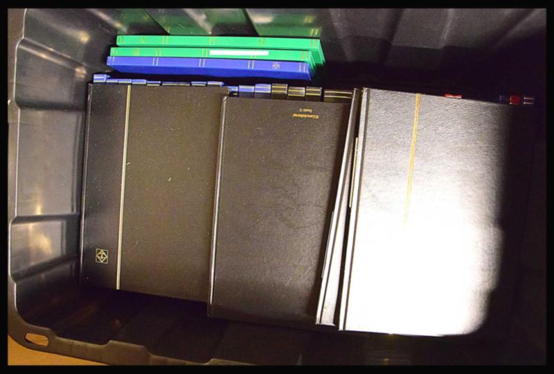 SUPPLY LOT. Box with 4 stockbooks 32 pages, 1 stockbook 16 pages, 5 small stockbooks 12 black pages, 1 binder Lighthouse with case, 4 small binders with whites pages, 1 album Heritage and 1 album Tradition. Starting bid $100.00. (Image1)