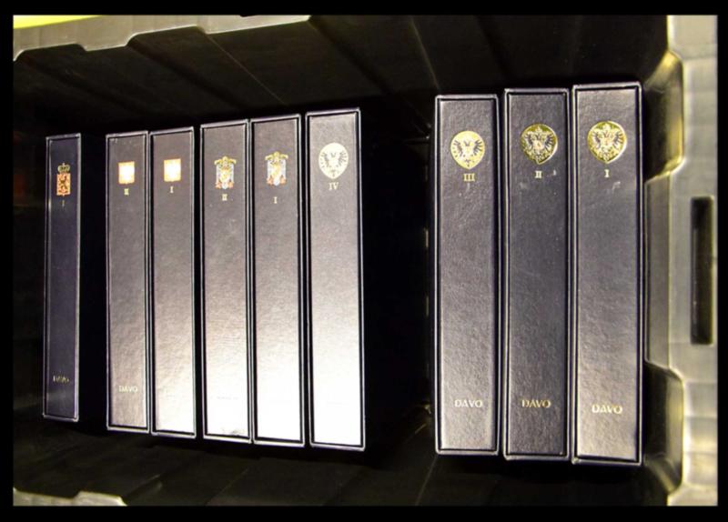 SUPPLY, LOT OF 9 DAVO ALBUMS VF. Lot of 9 Davo luxury hingeless albums with slipcases, Austria Vol 1 (1850 to 1937), Vol 2 (1945 to 1969), Vol 3 (1970 to 1989) Vol 4 (1990 to 2003), Spain Vol 1 (1850 to 1944) Vol 2 (1945 to 1969), Poland (1853 to 1945) including a section of the German Reich (1940 to 1944), Vol 2 (1944 to 1959), Finland Vol 1 (1856 to 1979). Estimated value $1350.00 CAD. (Image1)