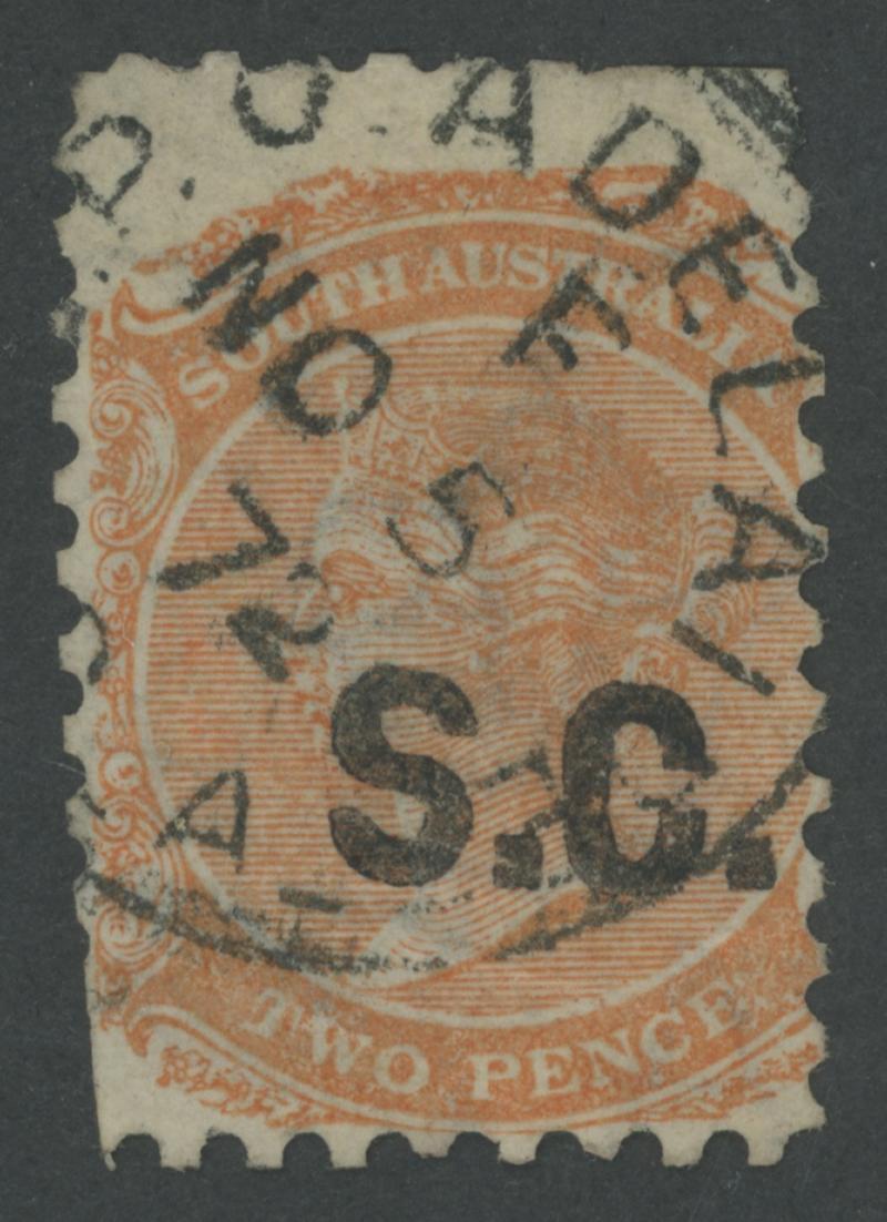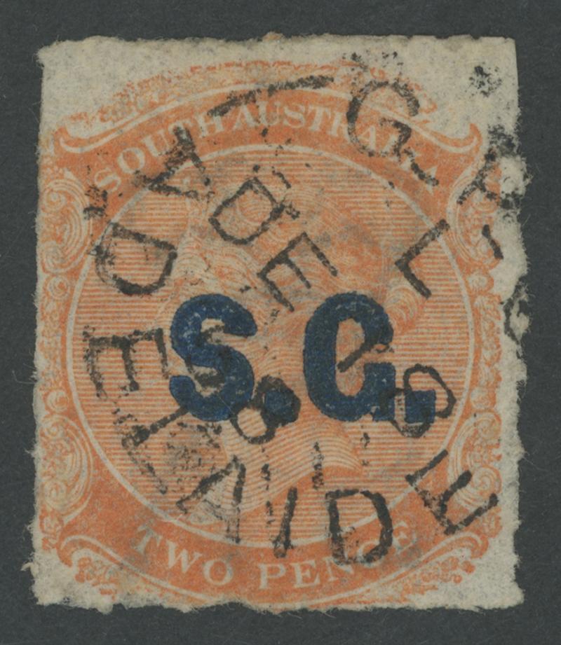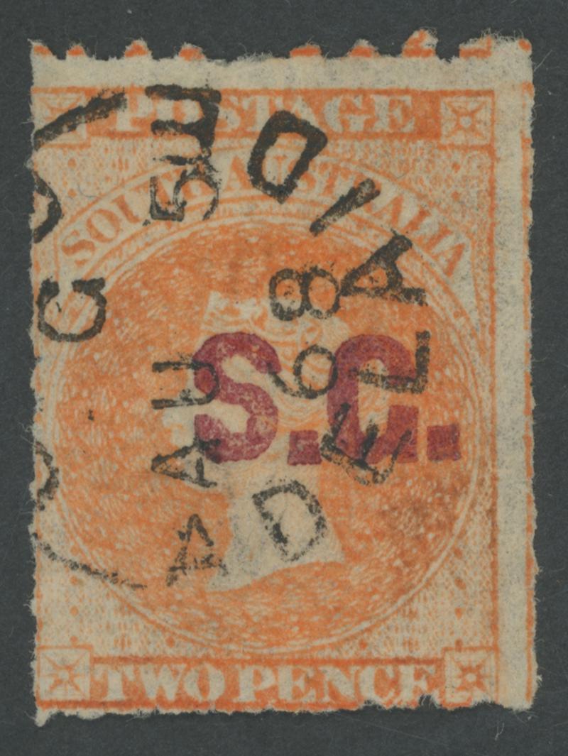 BLACK OVERPRINT: 'S.C.' (Error of Lettering for 'S.G.') on QV De La Rue Crown/SA Wmk Perf 10 2d dull orange SG DO512, several trimmed perfs at top & lower-left, fine GPO cds of 'NO5/72', Cat £400. Rated RRR (in error under Supreme Court, that was not allocated stamps from this issue until 1873). Ex 'Sir Humphrey' (Brian Farmer): sold for $233 (Sale 118 Lot 567). Chris Ceremuga Certificate (2019) states "very rare". Gary Diffen's very fine example - stated by him "about five known" - sold for £480. Don Pearce's two superb examples sold for $505 and $900 (Sale 247 Lots 781 & 782) respectively. Absent from the Vestey and 'Besancon' collections. [Date range for the error 21.3.1871 to 5.11.1872] (Image1)