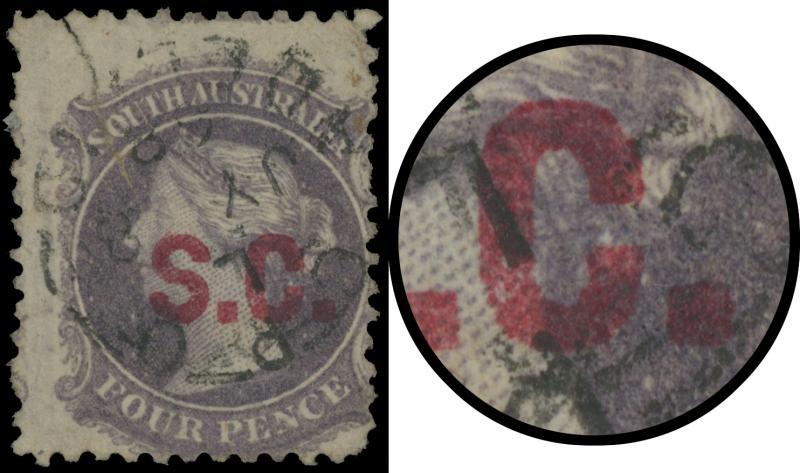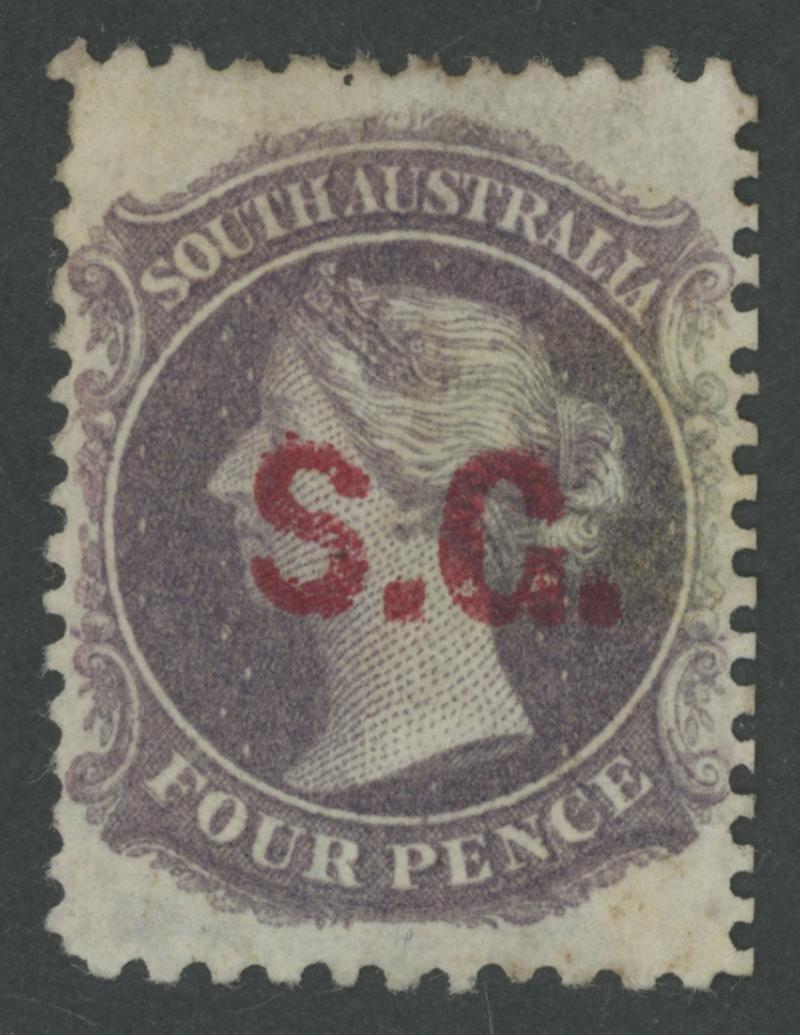 RED OVERPRINT: 'S.C.' (Error of Lettering for 'S.G.') on QV Perkins Bacon Large Star Wmk Perf 11½-12½ 4d dull violet SG DO503a, minor perf defects & 12mm tear at upper-left, light GPO cds of 'JY8/68', Cat £500. Unlisted by Ron Butler and the only example recorded so it should be rated RRRRRR. Ex Don Pearce: sold for $455 (Sale 247 Lot 774). Note: there was no allocation of 4d stamps to the Supreme Court. (Image1)