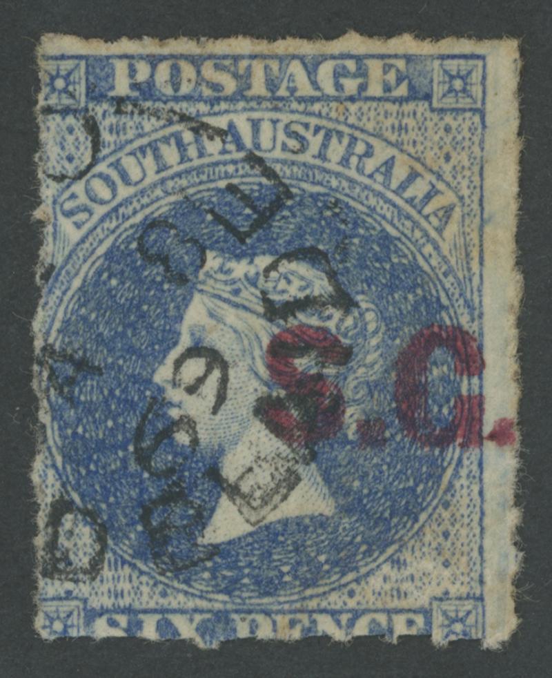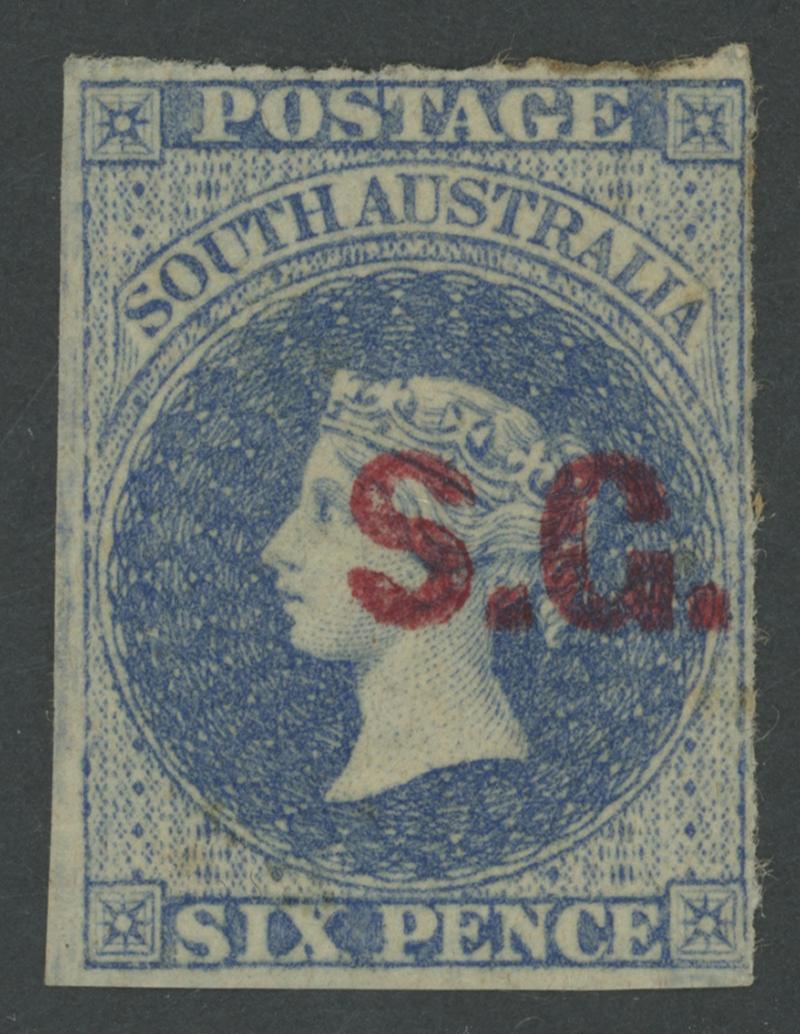 RED OVERPRINT: 'S.G.' on QV Perkins Bacon Large Star Wmk Rouletted 6d dull ultramarine SG DO502, rouletting at top & right and cut from the sheet clear of the design at left & base, large-part mottled gum, Cat £650. Rated RRRR. Ex Rev James Mursell and Colonel Napier (II). Chris Ceremuga Certificate (2019) states "extremely rare...original gum...superb example". A similar example sold at our auction of 29.11.2008 for $1515 (Sale 141 Lot 561). The 'Besancon' example - "shaved at left" sold for SFr605. Don Pearce's example - graded 'B' - sold for $835 (Sale 247 Lot 775). (Image1)