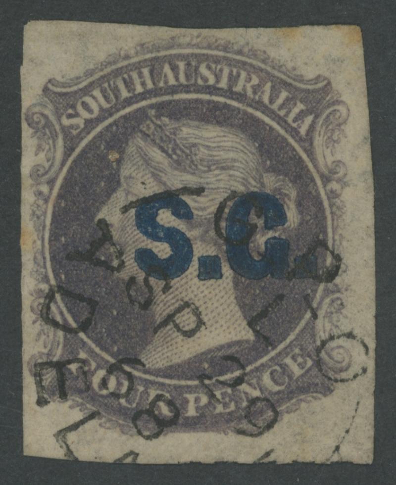 BLUE OVERPRINT: 'S.G.' on QV Perkins Bacon Large Star Wmk Rouletted 4d dull violet SG DO505, rouletting at the base and otherwise cut from the sheet clear of the design, very fine GPO cds of 'SP29/68', Cat £650. Rated RRRR; unrecorded unused. Ex 'Novocastrian' (Warwick Nott): sold for $950 (Sale 198 Lot 2168). RPSV Certificate (2015). The similar 'Besancon' example - also apparently rouletted only at the base, "tiny thin" - sold for SFr605. Don Pearce had a rejoined horizontal pair that was completely imperforate, estimated at $2500 but unsold (Sale 247 Lot 780). [Date range 25.9.1868 to 30.9.1868 only] (Image1)